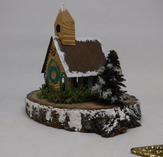 Like I mentioned in my last post, I have these wood slices from tree branches that I have to find a use for. After looking through my crafting stash, I came across a few glittered churches from the Dollar Tree that I picked up last year. All I had to do to create a wintery scene was to apply a little hot glue to the bottom of the church, add a few bottle brush trees and sprinkle the piece with a little artificial snow.I liked it so much, I decided to make two.